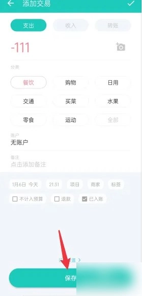 3、在添加交易页面,选择记账的分类和交易类型,点击下方的保存即可完成手动记账。