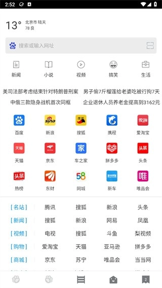 打开软件后,在首页能够搜索网址,同时也能使用新闻、小说、视频等服务。
