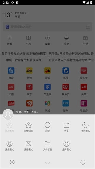 2、点击正下方的图标会有收藏/历史、夜间模式、无痕模式等功能;