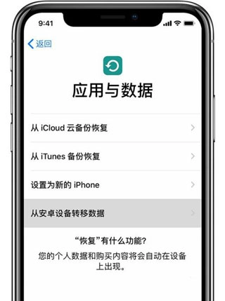 1、在iPhone上激活到【应用与数据】时,选择【从安卓设备转移数据】。