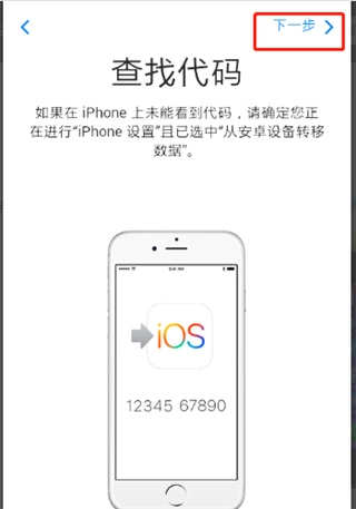 在安卓设备上,打开“转移到 iOS”App 并轻点“继续”。阅读显示的条款和条件。轻点“同意”以继续,然后轻点“查找代码”屏幕右上角的“下一步”。这个时候,两台手机尽量靠近点。等待代码
