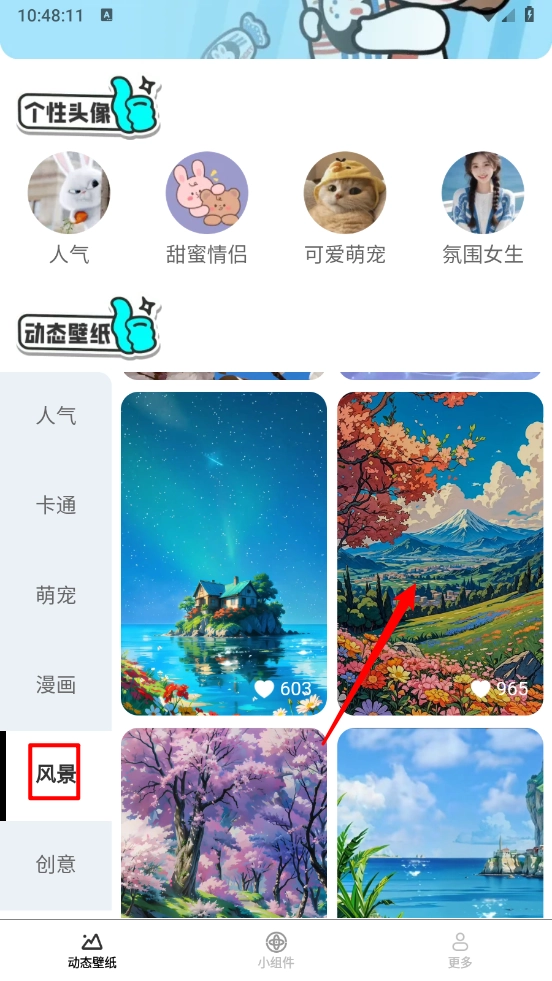 2、如图,这里以"风景"板块为例,选择并点击壁纸进入。