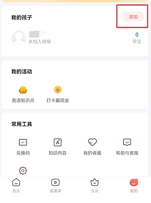 1、打开家长通应用,进入“我的孩子”页面后点击添加按钮;