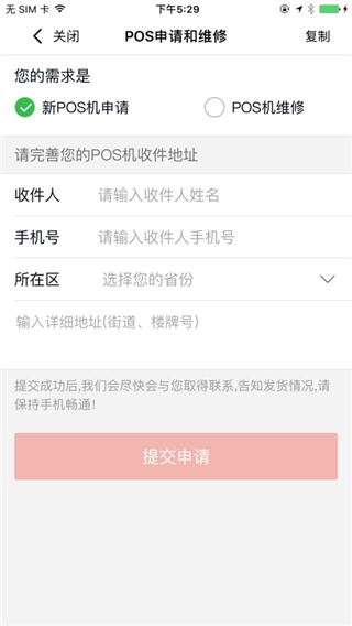 2、点击机具申请就可以进入POS机的申请和维修界面,填入相应的信息即可;