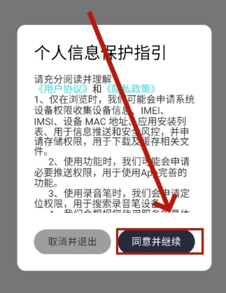 1、下载安装声云语音转写应用后将其打开,随后点击“同意并继续”按钮