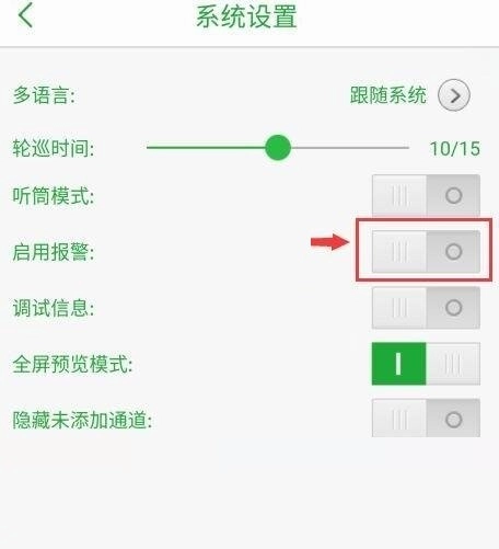 3、进入“系统设置”页面,点击“启用报警”右边滑块来打开报警开关。