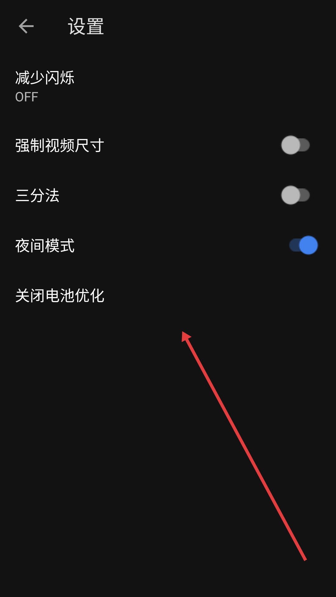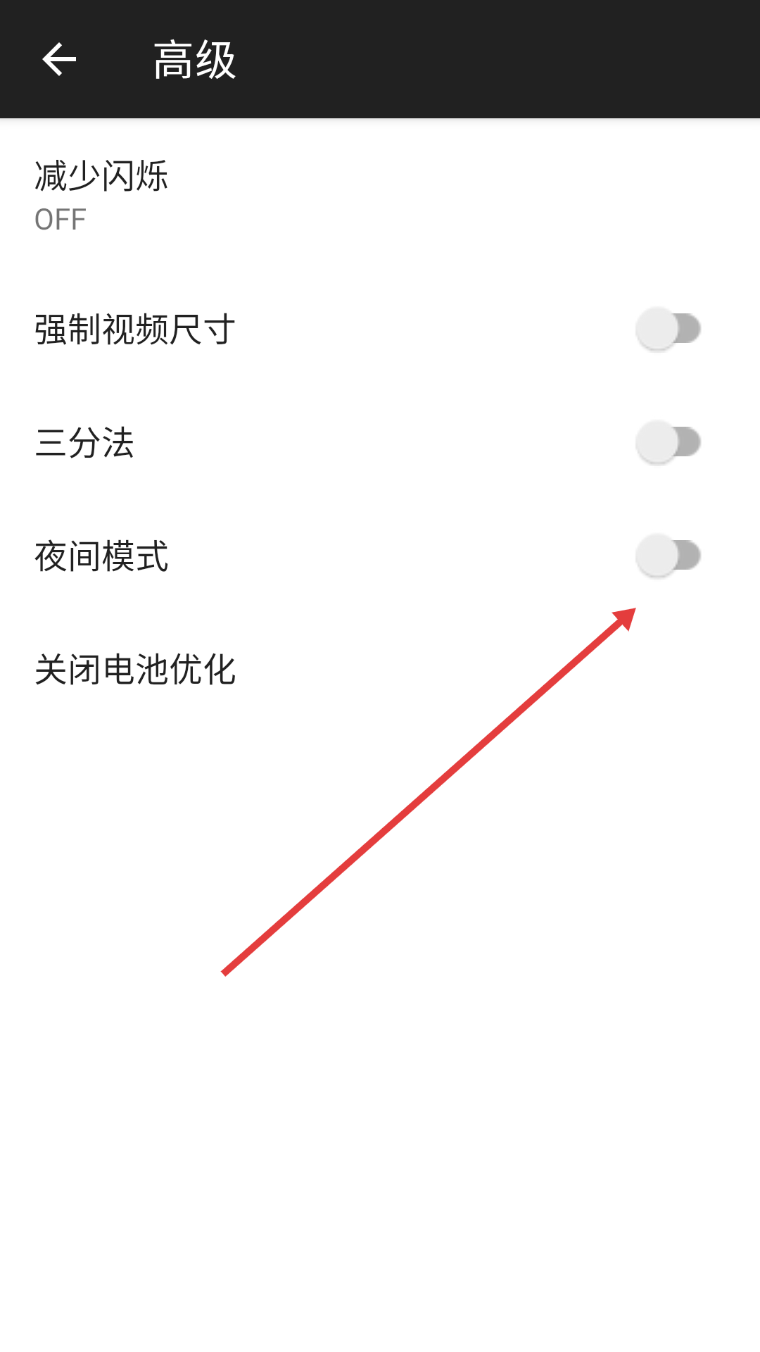 3、在高级设置界面找到【夜间模式】开关,准备开启。