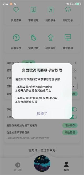 1、打开魔音morin,点击“我的”,里面有一个“显示桌面歌词”的选项