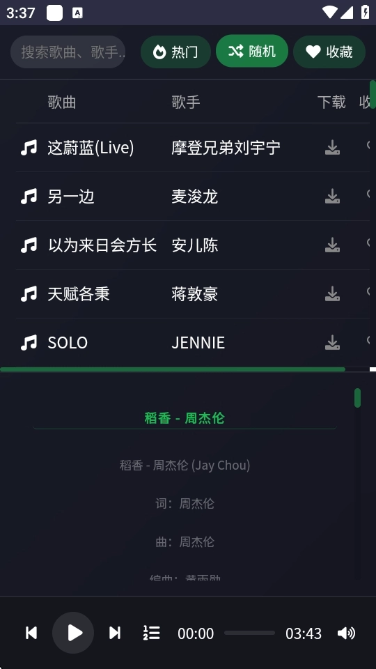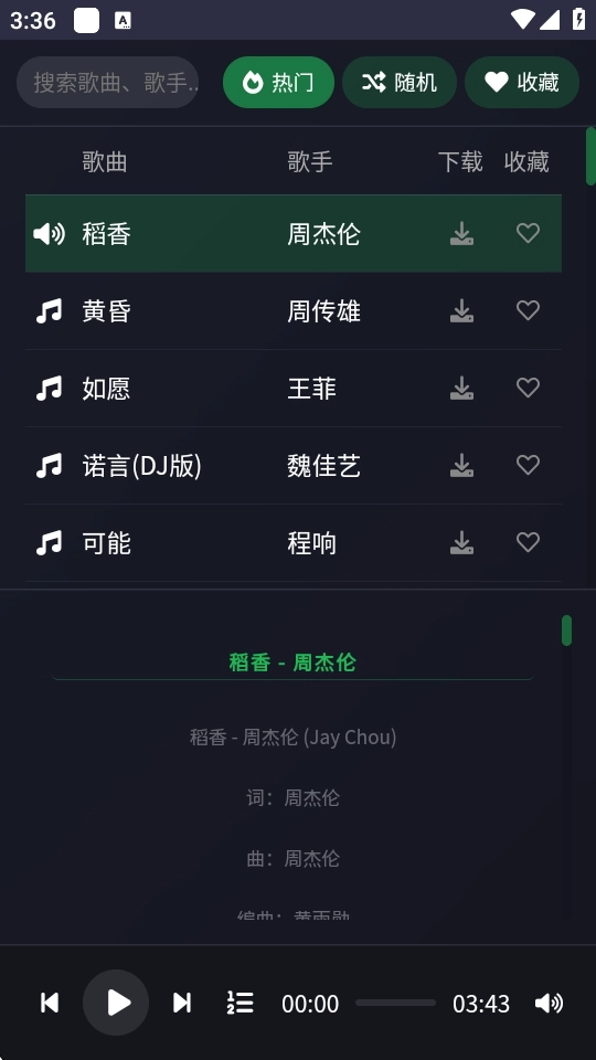 2、自由挑选心仪曲目进行播放,例如选择周杰伦经典作品《稻香》点击试听。