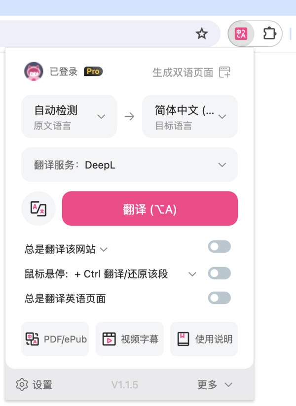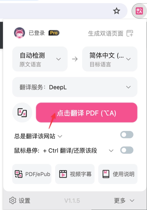 安装插件后,【右上角将沉浸式翻译浏览器图标置顶】,然后点击【沉浸式翻译扩展图标】,再点击翻译即可进行翻译: