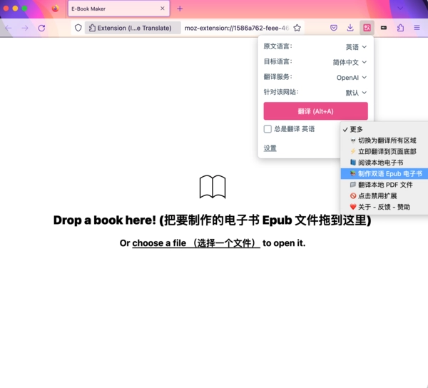 点击插件图标—>更多,选择“阅读电子书”(支持Epub,Mobi等常见格式)或者“制作双语Epub电子书”。