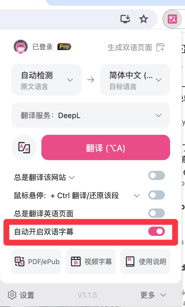 随便打开一个视频点击沉浸式翻译面板,然后选中【自动开启双语字幕】即可开启。如果您选择的设置在视频中没有生效,一般刷新页面即可。