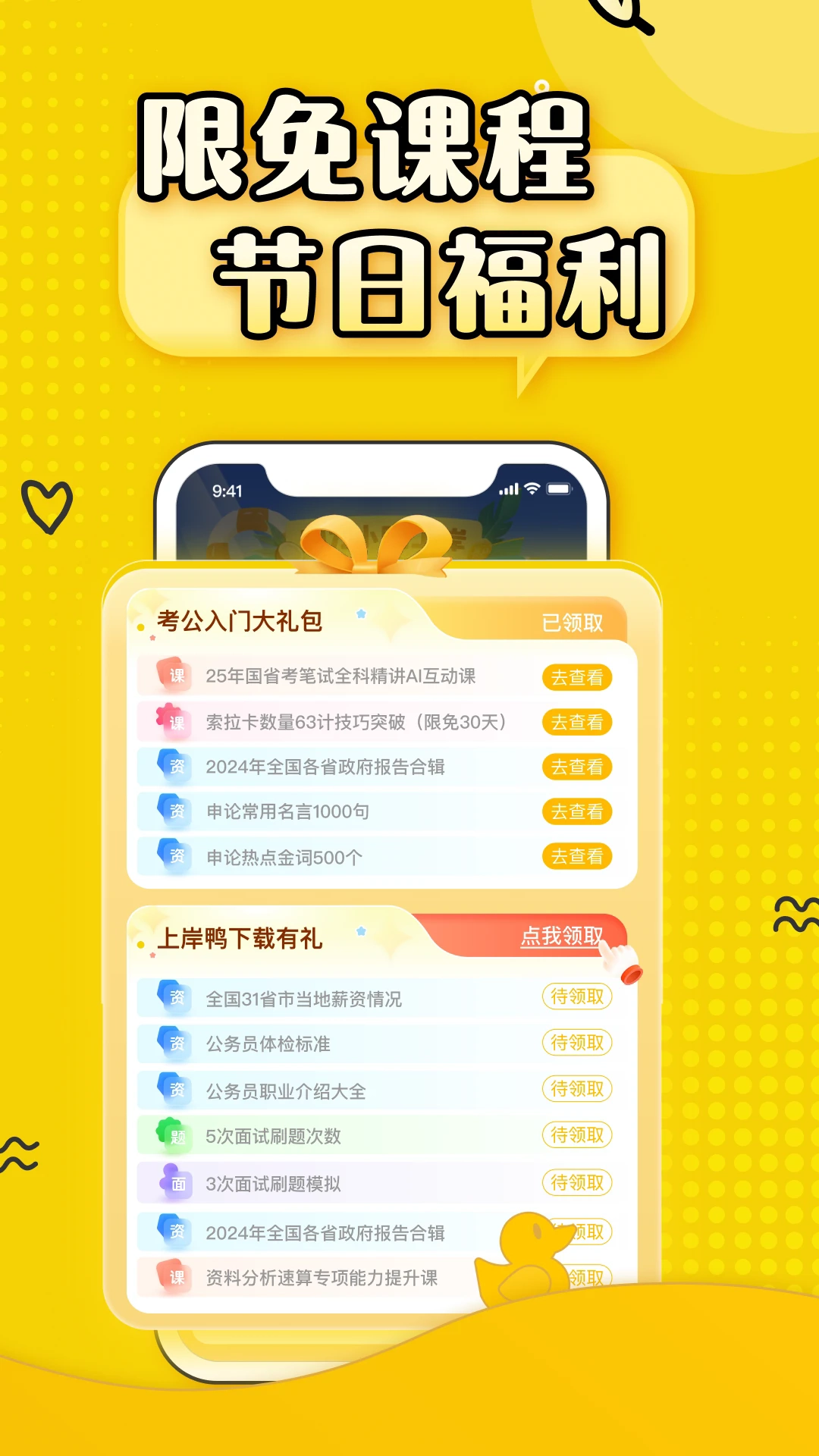上岸鸭公考1.6.18是一款可以让你轻松学习各类考公知识的教育类应用,里面收录了历年的各类学习资料,还从不同领域整合了丰富的题目内容。这里不仅模拟了真实的笔试题目,还有面试相关的题目,通过多维度的模拟练习,能帮助你充分了解自己的不足之处,快来体验吧。