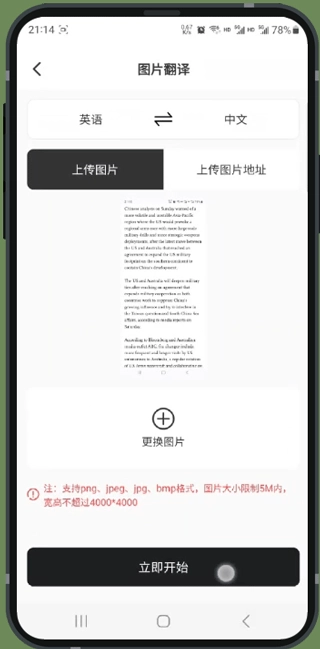 讲图片中的文字翻译成对应语言,支持拍照翻译,相册图片翻译,网络图片翻译。翻译结果可直接储存为新图片