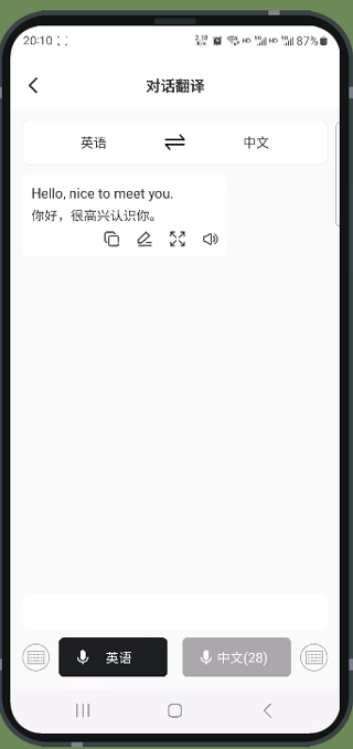 可识别两种语言,实现你说一句翻译一句,我说一句翻译一句的简单交流对话。