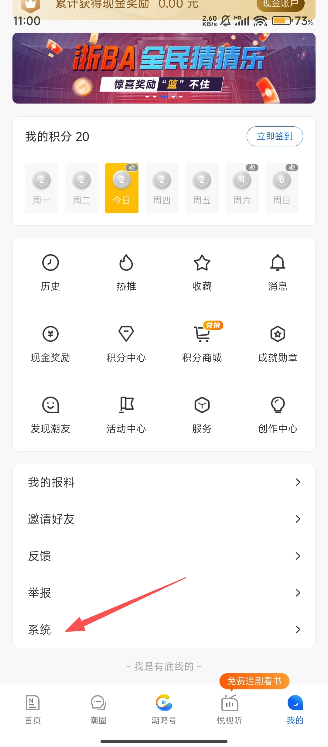 2、进入到右下角的“我的”界面中,需要向上滑动屏幕,选择列表最底部的“系统”选项进行点击。