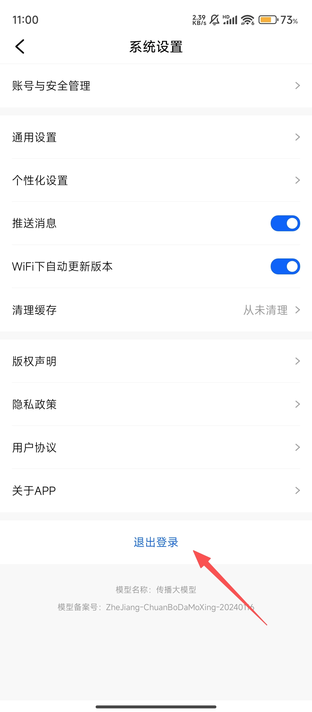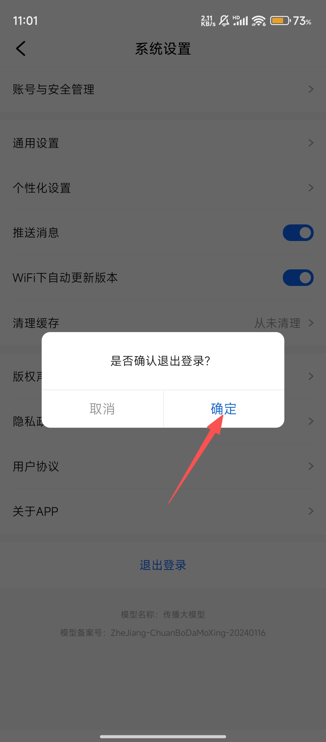 3、进入系统设置后,点击【退出登录】按钮,此时会弹出确认框,就等最后一步确认啦。