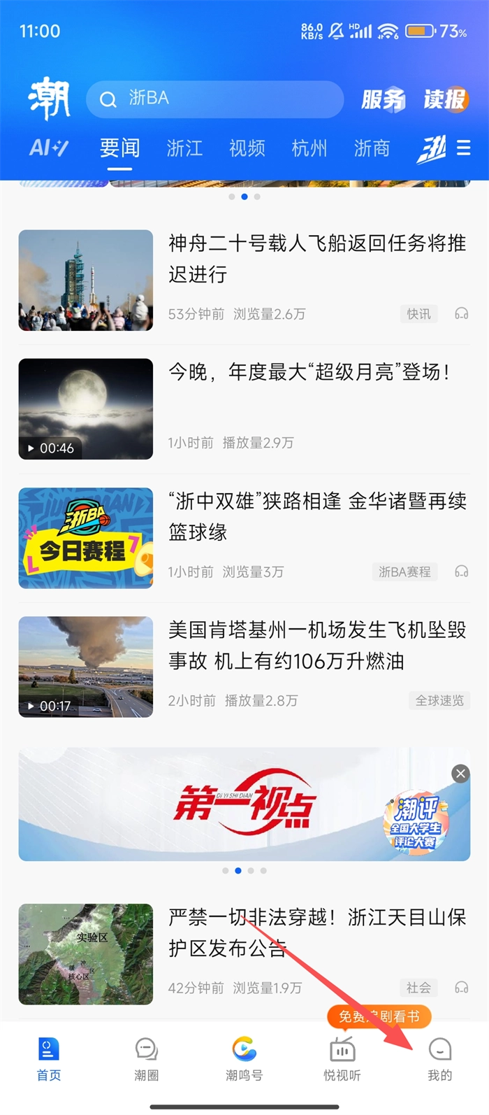 1、打开潮新闻应用,点击底部导航栏的【我的】选项,即可启动账号退出的操作流程。