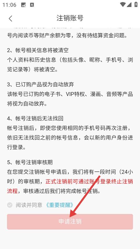 3、在注销账号页面,勾选阅读并同意《重要提醒》后,点击【申请注销】按钮,弹出温馨提示弹窗。