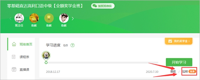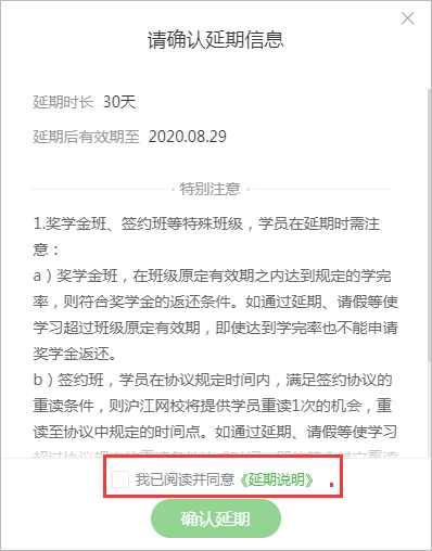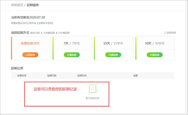 注意:不同课程,延期次数和延期的方式会有不同,具体以进入班级点击延期为准。