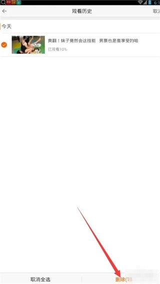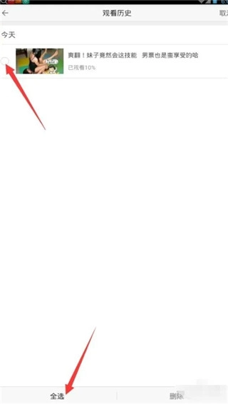 5、然后,选择好要删除的视频,小编的看片记录较少,如果太多的话可以点击全选按钮,这样就能将视频全部选定了!