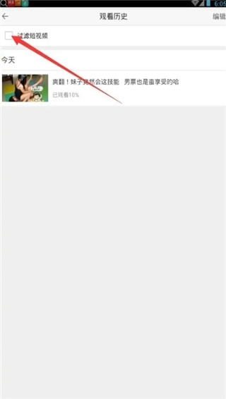 3、软件有历史分类功能,对于那些简短的视频,都可以过滤掉,这样就能找到我们看过的大片,而忽略了那些短暂的花絮!点击下图的位置,就会自动过滤掉短视频了!