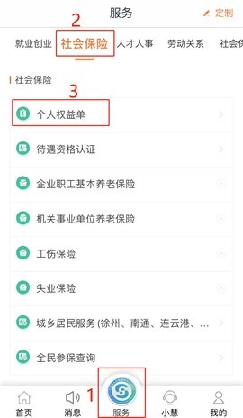 二、登陆后,点击“服务”,选择“社会保险”,点击“个人权益单”